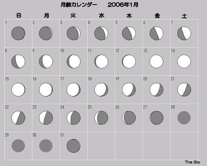 日付 出 正中 没 01 1 2006 3:31:55 8:21:43 13:11:25 11 1 2006 3:00:54 7:48:23 12:35:48 21 1 2006 2:28:44 7:14:17 11:59:46 31 1 2006 1:55:17 6:39:18 11:23:15