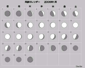 日付 出 正中 没 01 1 2006 12:41:34 20:08:11 3:37:36 11 1 2006 12:07:58 19:40:20 3:15:07 21 1 2006 11:36:30 19:15:25 2:56:27 31 1 2006 11:06:59 18:52:53 2:40:42