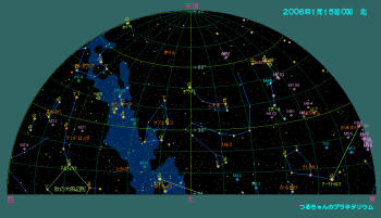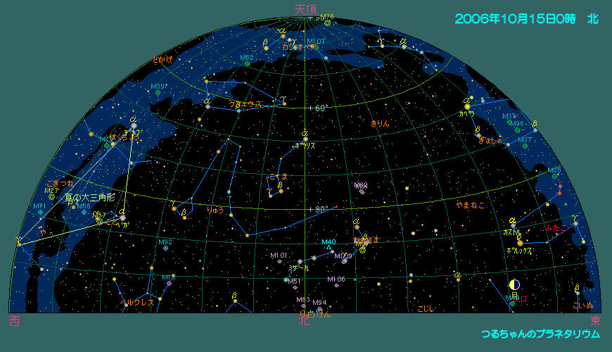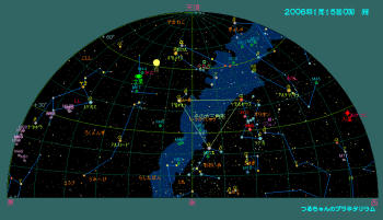 双眼鏡で観望出来る天体はプレアデス星団(M45)、ヒアデス星団、アンドロメダ大星雲(M31)とペルセウス座の2重星団(h-χ、エイチ・カイと読む)、散開星団(M34)とオリオン座大星雲(M42)。オリオン座にはウルトラマンの故郷「M78星雲」も有りますが、これは望遠鏡が無いと見えません。おおぐま座の子連れ星雲(M51)と銀河カップル(M81とM82)は是非一度大型の望遠鏡で観望して下さい。 1月の天気 1月15日0時頃の空