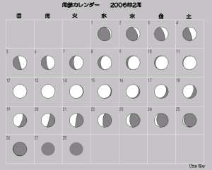 日付 出 正中 没 01 2 2006 1:51:52 6:35:44 11:19:34 11 2 2006 1:16:49 5:59:37 10:42:22 21 2 2006 0:40:13 5:22:22 10:04:29 03 3 2006 0:01:57 4:43:54 9:25:51