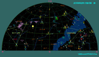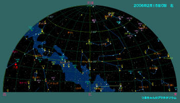 今月は特にトピックは有りませんが、火星がプレアデス星団とヒアデス星団の間を渡ってゆくのが観望出来ます。連続写真を撮って楽しむのも良いでしょう。 双眼鏡で観望出来る天体はプレアデス星団(M45)、ヒアデス星団、アンドロメダ大星雲(M31)とペルセウス座の2重星団(h-χ、エイチ・カイと読む)、散開星団(M34)とオリオン座大星雲(M42)。オリオン座にはウルトラマンの故郷「M78星雲」も有りますが、これは望遠鏡が無いと見えません。おおぐま座の子連れ星雲(M51)と銀河カップル(M81とM82)は是非一度大型の望遠鏡で観望して下さい。 2月の天気2月15日0時頃の空