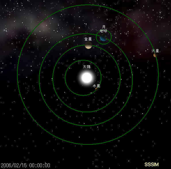 日付 出 正中 没 01 2 2006 16:32:04 0:16:23 7:56:24 11 2 2006 15:48:14 23:29:35 7:15:08 21 2 2006 15:04:48 22:47:19 6:34:00 03 3 2006 14:21:58 22:05:28 5:53:06
