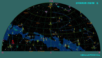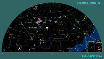 惑星達も交代で空に昇ります。特に一晩中観望できる土星と夜半頃東の空に顔を出す木星が見ごろです。火星も目立たなくなりました。金星も明けの明星として輝きます。水星も目の良い人なら夜明け前の空に見つけ出すことが出来るでしょう。 3月の天気 3月15日0時頃の空