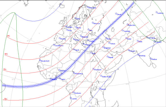 北緯50度 東経10度 夏時間 部分食開始 11.44.16 食最大 12.42.50 42.70% 部分食終了 13.42.10