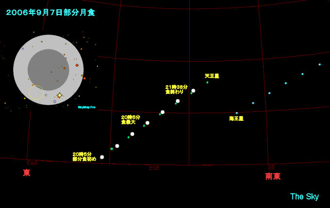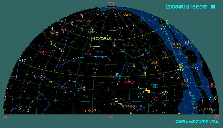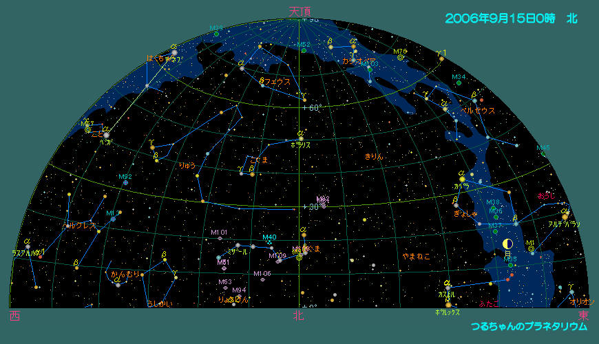 今月のハイライトは7日の部分月食です。19%しか欠けない目立たない月食でが、ドイツからは全行程観望出来ます。特にイベントの少ない月ですが、夜が日増しに長くなり、23日の秋分を境に夜が長くなります。星好きには良い季節になりました。 薄明後の9月の空はまだまだ夏の星座で空は一杯です。昼と夜の長さが同じになる23日の秋分の日を迎えるまでには、秋の四辺形(ペガスス座)が次第に高度を上げてきて、夜空は秋の星座に入れ替わります。あの有名なアンドロメダ大星雲(M31)も見ごろになってきました。夜半過ぎには双子座やオリオン座等の冬の星座が東の空に上ってきます。やっと夜が長くなり、星好きには良い季節となりました。