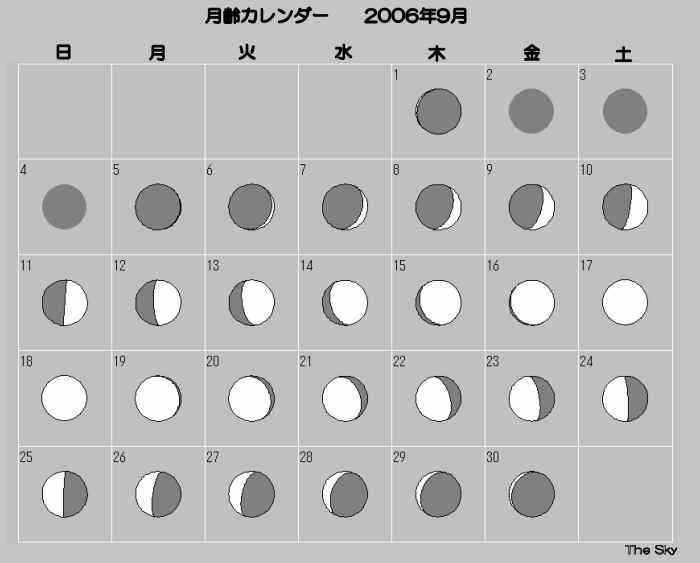 日付 出 正中 没 01 9 2006 6:30:49 13:23:39 20:14:18 11 9 2006 7:37:15 13:51:21 20:03:30 21 9 2006 8:33:34 14:11:03 19:46:54 01 10 2006 9:21:47 14:25:41 19:28:14