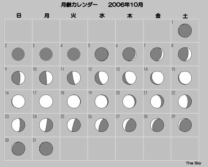 日付 出 正中 没 01 10 2006 18:02:05 23:21:55 4:45:50 11 10 2006 17:22:14 22:41:25 4:04:39 21 10 2006 16:42:28 22:01:06 3:23:48 31 10 2006 15:02:47 20:21:03 1:43:20