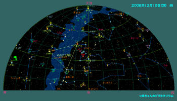 9日から12日の早朝7時頃、未だ暗い南東の空で火星、木星、水星のランデブーが観望出来ます。地平線ぎりぎりのところでの現象ですので、双眼鏡で観望して下さい。 その他に双眼鏡で観望出来る天体はプレアデス星団(M45)、ヒアデス星団、アンドロメダ大星雲(M31)とペルセウス座の2重星団(h-χ、エイチ・カイと読む)、散開星団(M34)とオリオン座大星雲(M42)。オリオン座にはウルトラマンの故郷「M78星雲」も有りますが、これは望遠鏡が無いと見えません。おおぐま座の子連れ星雲(M51)と銀河カップル(M81とM82)は是非一度大型の望遠鏡で観望して下さい。 12月の天気 12月15日0時頃の空