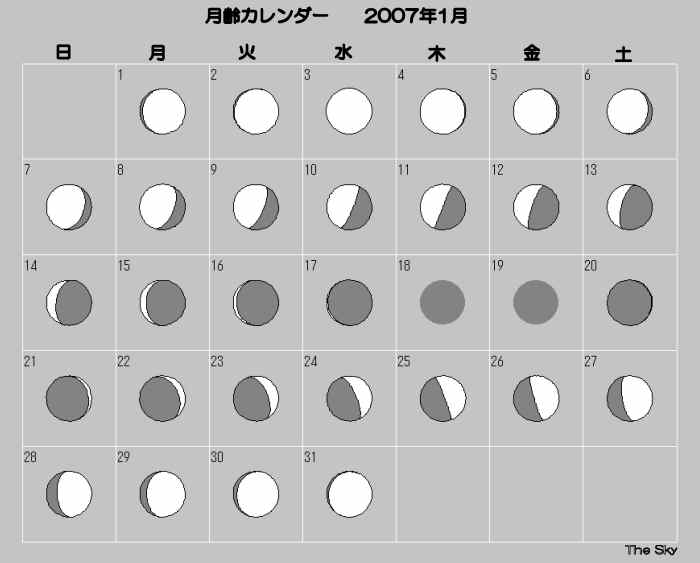 日付 出 正中 没 01 1 2007 8:17:09 12:09:01 16:00:55 11 1 2007 8:40:01 12:40:28 16:41:28 21 1 2007 8:47:38 13:11:42 17:36:52 31 1 2007 8:39:32 13:37:21 18:36:39