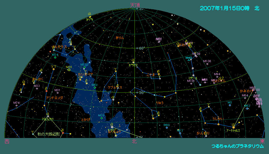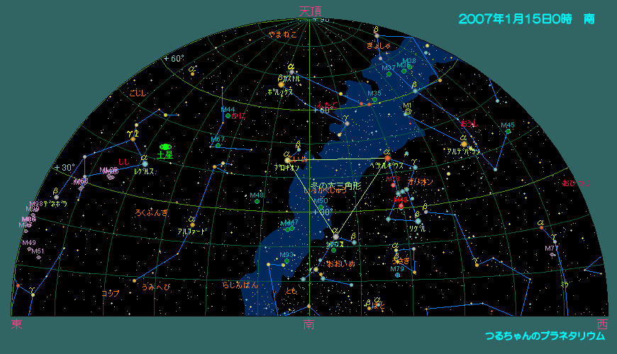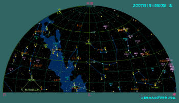 土星以外の明るい惑星達は太陽の近くに居て、朝夕の空に薄明の中僅かな時間のみ観望可能です。 双眼鏡で観望出来る天体はプレアデス星団(M45)、ヒアデス星団、アンドロメダ大星雲(M31)とペルセウス座の2重星団(h-χ、エイチ・カイと読む)、散開星団(M34)とオリオン座大星雲(M42)。オリオン座にはウルトラマンの故郷「M78星雲」も有りますが、これは望遠鏡が無いと見えません。おおぐま座の子連れ星雲(M51)と銀河カップル(M81とM82)は是非一度大型の望遠鏡で観望して下さい。 1月の天気 1月15日0時頃の空