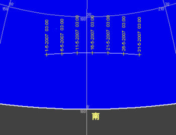 日付 出 正中 没 01 5 2007 4:30:50 10:06:50 15:43:30 11 5 2007 4:05:19 9:55:34 15:46:31 21 5 2007 3:39:34 9:44:02 15:49:14 31 5 2007 3:13:45 9:32:19 15:51:36 ![]()