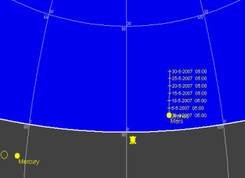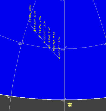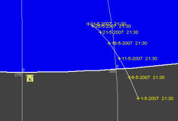 日付 出 正中 没 01 5 2007 23:45:52 3:57:08 8:04:06 11 5 2007 23:02:18 3:14:06 7:21:30 21 5 2007 22:17:44 2:30:10 6:38:08 31 5 2007 21:32:30 1:45:39 5:54:18 ![]()