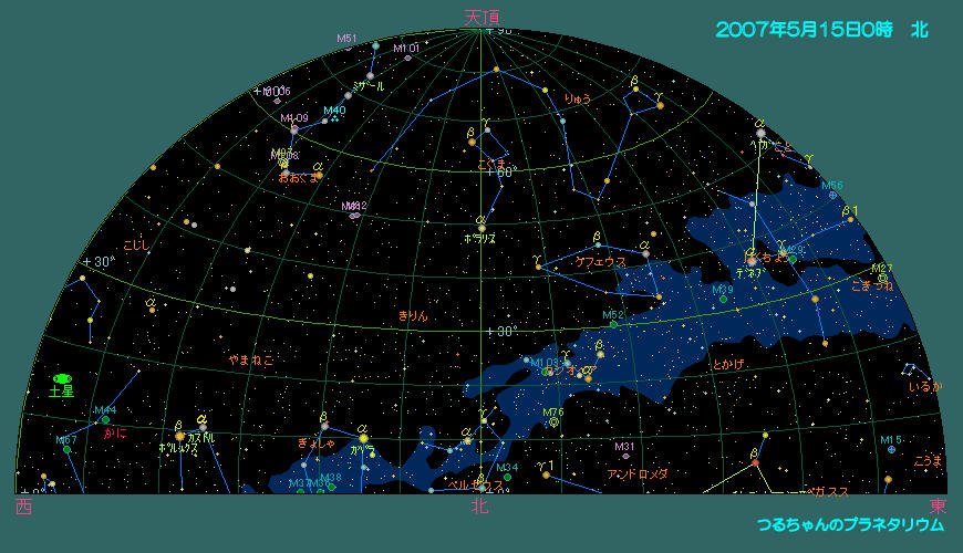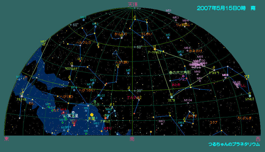 特に目立った星は有りませんが、ヘルクレス座の散会星団M13やおおぐま座の親子銀河M51などが天頂に昇り望遠鏡での観望がし易くなります。 今は花粉の時期でも有ります。花粉症の人には憂鬱な季節ですが、この花粉の為に太陽の回りにカラフルな花粉光輪が見える事が有ります。花粉が多く飛んでいるときは是非注意して見て下さい。出来ればサングラスを掛けるとか、手で太陽を遮るなど光線が直接目に入らないように配慮して見て下さい。 5月の天気 5月15日0時頃の空