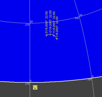 日付 出 正中 没 01 5 2007 5:57:17 13:09:55 20:25:16 11 5 2007 5:59:28 13:55:32 21:54:05 21 5 2007 6:14:46 14:36:54 22:59:52 31 5 2007 6:35:32 14:58:13 23:20:13 ![]()