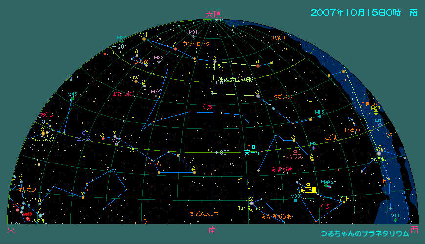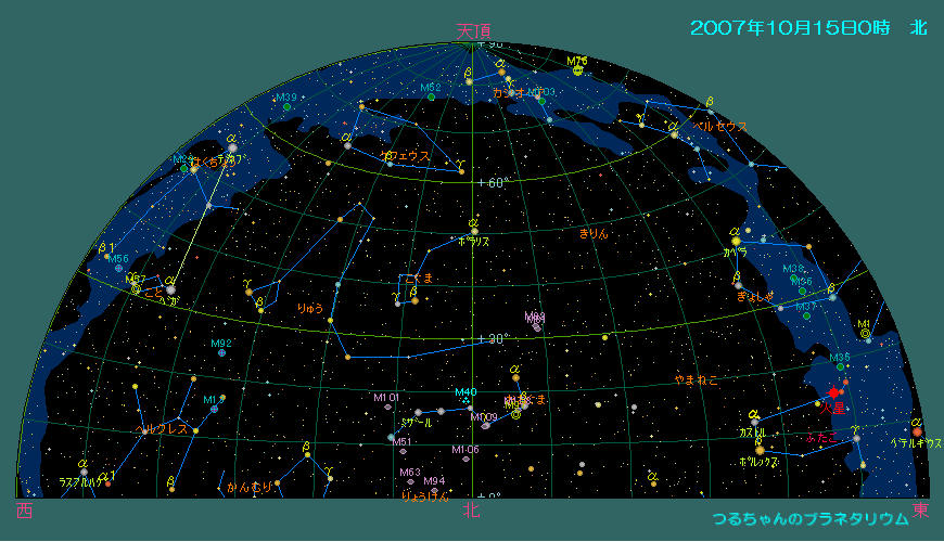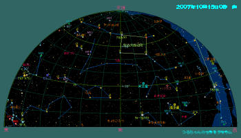10月28日から冬時間へと切り替わります。寒い季節が始まりますが、夜が長くなると共に観測できる時間も格段に増えるわけです。今年は太陽の活動が余り活発で有りませんが、条件が良ければオーロラ観望出来るかもしれません。9月下旬に既に北極圏で活発なオーロラが観測されています。毎日アレートをしっかりチェックして下さい。 今月は特に目立ったハイライトは有りません。宵の空には西に傾いた夏の三角形を構成すること座(ベガ)、白鳥座(デネブ)、わし座(アルタイル)等の夏の星座が空を占領していますが、すっかり暗くなる頃には秋の四辺形(ペガスス座)、カシオペア座も天頂付近迄昇ります。アンドロメダ大星雲(M31)も見ごろです。北斗七星はひしゃくを上に向けて北の空低く寝そべっています。高緯度で見る大熊座は一年中地平線の下に沈みません。低い南の空には秋の星座で唯一の一等星(フォーマルハウト)を持つみなみのうお座が見えます。東にはペルセウス座が高く上り、低い空にはぎょしゃ座のカペラが目立つようになります。このカペラも一年中地平線下に沈みません。夜半過ぎにはプレアデス星団、ヒアデス星団を抱えるおうし座に続いて双子座やオリオン座等の賑やかな冬の星座が昇ってきます。これらの星団は双眼鏡で十分観望出来ます。 今月の惑星は光度を落とした木星が日没後の南西の空低く見えています。夜半前には火星が昇り、夜明け前には金星と土星が並んで東の空に昇ってきます。7日の夜明け前と日没後に金星、土星、月のランデブーが観望出来ます。衝の近い火星はこれからが見ごろになります。 10月の天気 10月15日0時頃の空