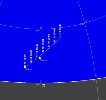 8月22日に回り合となった土星は、次第に太陽から遠ざかり夜明け前の空に観望出来ます。7日の日没前後の薄明時に金星と月のランデブーが観望出来ます。