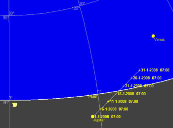 先月23日に合となった木星は今月ほぼ観望不可能です。1月下旬頃から明け方の南西の空低くその姿を見せますが、よほど慣れた人で無いと観望は難しいでしょう。