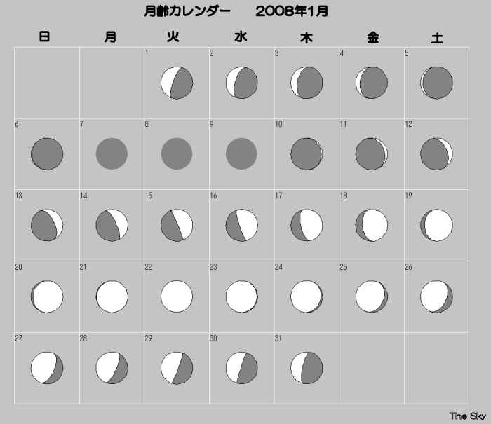 日付 出 正中 没 01 1 2008 15:01:54 23:34:07 8:11:49 11 1 2008 14:08:34 22:41:05 7:18:40 21 1 2008 13:21:43 21:53:29 6:29:45 31 1 2008 12:41:05 21:11:49 5:46:29 ![]()