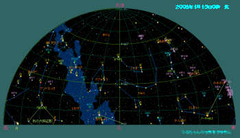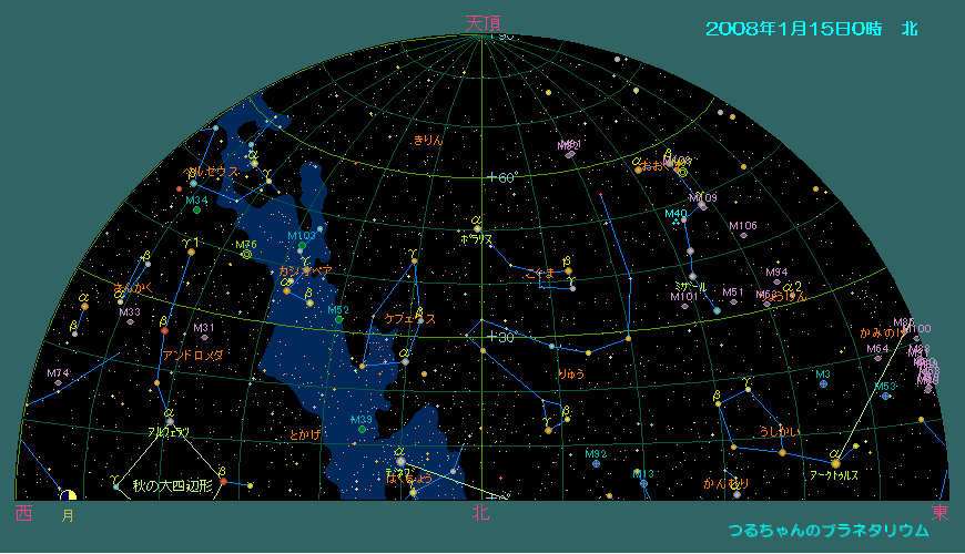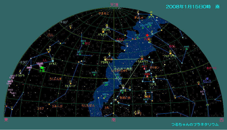 今月の惑星は火星と土星がほぼ一晩中観望可能です。金星は明けの明星としてまだまだ夜明け前の空に輝きます。その他の明るい惑星は太陽に近く観望は難しいでしょう。 双眼鏡で観望出来る天体はプレアデス星団(M45)、ヒアデス星団、アンドロメダ大星雲(M31)とペルセウス座の2重星団(h-χ、エイチ・カイと読む)、散開星団(M34)とオリオン座大星雲(M42)。オリオン座にはウルトラマンの故郷「M78星雲」も有りますが、これは望遠鏡が無いと見えません。おおぐま座の子連れ星雲(M51)と銀河カップル(M81とM82)は是非一度大型の望遠鏡で観望して下さい。 1月の天気 1月15日0時頃の空