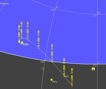 日付 出 正中 没 01 1 2009 10:22:18 15:14:14 20:06:12 11 1 2009 9:43:40 14:36:10 19:28:41 21 1 2009 9:05:06 13:58:12 18:51:19 31 1 2009 8:26:35 13:20:18 18:14:03 ![]()