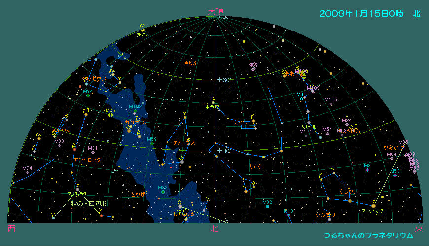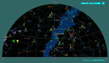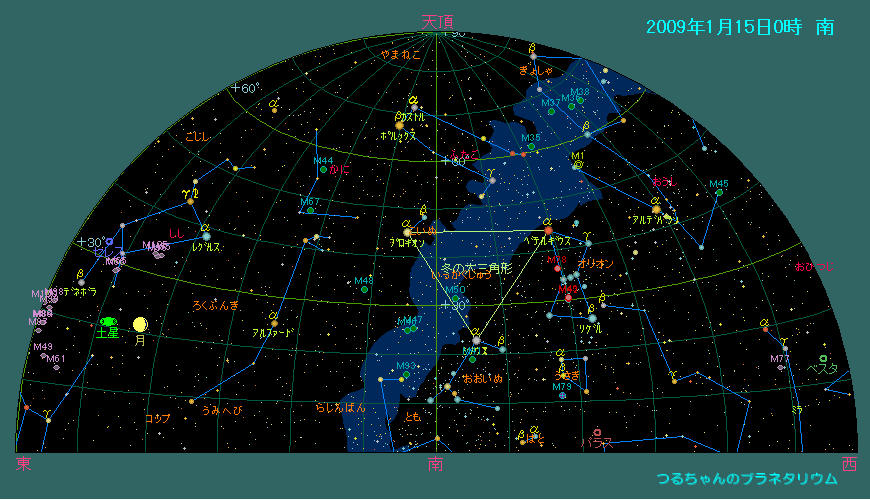 今月の惑星は環の消滅が近い土星はしし座の後足辺りに有り、ほぼ一晩中観望可能です。金星は宵の明星としてまだまだ夕方の空に輝きます。水星は日没直後、木星も夕方の早い時間のみ観望出来ます。 双眼鏡で観望出来る天体はプレアデス星団(M45)、ヒアデス星団、アンドロメダ大星雲(M31)とペルセウス座の2重星団(h-χ、エイチ・カイと読む)、散開星団(M34)とオリオン座大星雲(M42)。オリオン座にはウルトラマンの故郷「M78星雲」も有りますが、これは望遠鏡が無いと見えません。おおぐま座の子連れ星雲(M51)と銀河カップル(M81とM82)は是非一度大型の望遠鏡で観望して下さい。 1月の天気 1月15日0時頃の空