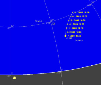 23日19時 金星と天王星が接近(南西、高度20度、間隔1.2度)**必見**