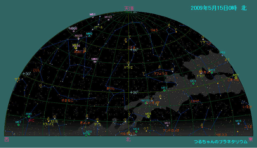 特に目立った星は有りませんが、ヘルクレス座の散会星団M13やおおぐま座の親子銀河M51などが天頂に昇り望遠鏡での観望がし易くなります。 今月の惑星は土星の観望条件が良い以外は、夜明け前に集中します。木星の出も早くなり、観望しやすくなります。 5月の天気 5月15日0時頃の空