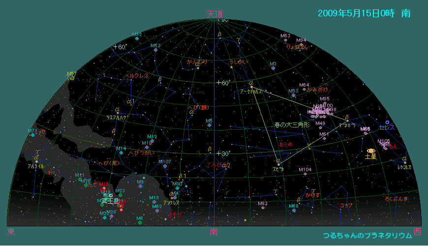 北斗七星は天頂まで昇り、おとめ座は南中します。その直ぐ下には独特の四辺形をしたからす座が見えています。しし座は南西に傾き、そこには土星も輝いています。更に西にはふたご座が見えています。東の空にはうしかい座、ヘルクレス座、こと座、白鳥座が昇り、夜半過ぎには南東の空にさそり座の頭部が見えてきます。