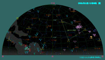 4月は例年に無く比較的暖かく、花粉が一挙に飛び出しました。花粉症の人には憂鬱な季節ですが、この花粉の為に太陽の回りにカラフルな花粉光冠が見える事が有ります。花粉が多く飛んでいるときは是非注意して見て下さい。出来ればサングラスを掛けるとか、手で太陽を遮るなど光線が直接目に入らないように配慮して下さい。 日も長くなり、空が完全に真っ暗になるのはほんの7時間程です。暖かくなるのは良いのですが、星好きには余り嬉しく無い時期になりました。