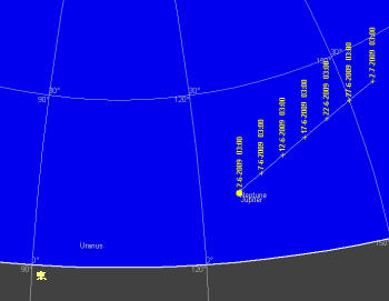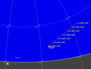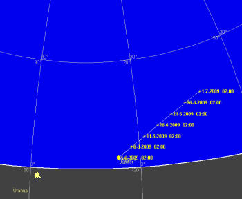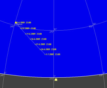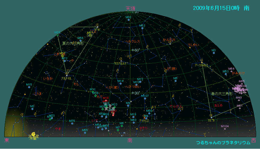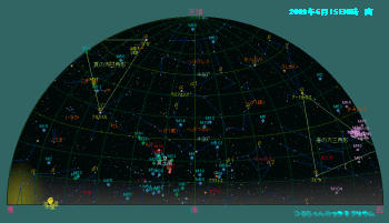 又この時期は夜光雲の季節でも有ります。2004年と2005年は6月から7月にかけて大変明るい夜光雲が天頂近くまで上ってきたのが観測されました。今年も既に先月下旬から高緯度に有る地域からその発生が報告されています。夜光雲はオーロラの様にアレート情報が有りませんので、毎日注意して夜空を観望するか、独流星研究会大気光学部門のBBSをこまめにチェックして下さい。このBBSは情報の速さではぴか一です。 今月は特に目だったハイライトは有りません。
