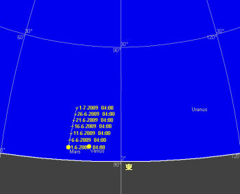 3月13日に合となった天王星は次第に太陽から離れ、夜明け直前の東の空で観望出来ますが、非常に暗い惑星なので観望には大型望遠鏡が必要です。