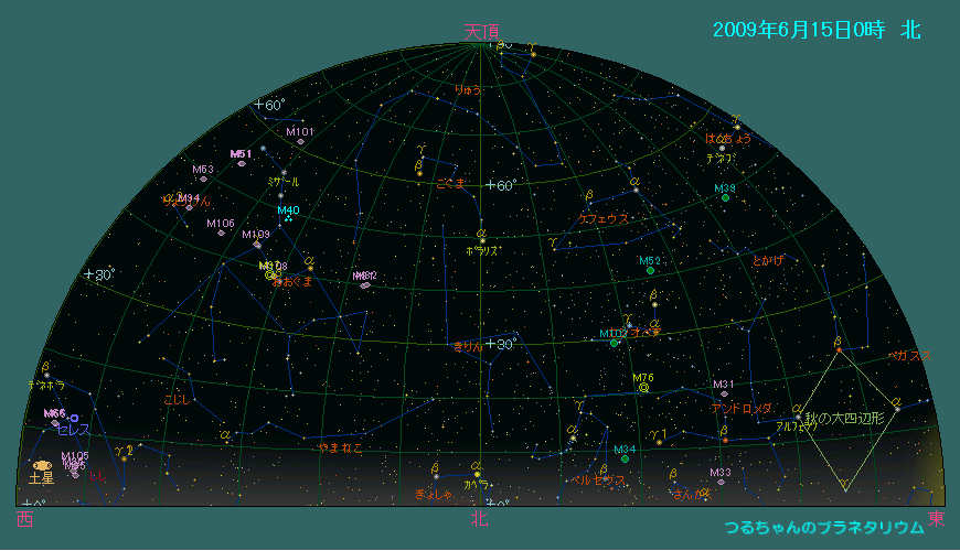 6月の夜空がすっかりおとなしい春の星座に入れ替わりました。牛かい座が南の空高く昇り、北斗七星が北の空高く、カシオペア座が地平線すれすれに見えています。西の空には春の星座を代表するしし座が傾き、その近くには土星が輝いています。南西にはおとめ座が見えています。夜半になると夏の星座が昇ってきます。さそり座、いて座、白鳥座、こと座、わし座などの明るい星座が夜空が飾ります。中央ヨーロッパから見るとさそり座も地平線を這う様に動きます。さそり座といて座の間には天の川銀河の中心部有り、その周りには沢山の星雲星団が有ります。アンドロメダ座のアンドロメダ大銀河(M31)、ペルセウス座の2重星団(h-χ、エイチ・カイと読む)と散開星団(M34)も夜明け前に東の空に昇り、ゆっくり観望出来る時期になりました。これらの星雲星団は双眼鏡が有れば十分です。かみのけ座銀河団も見ごろですので、お忘れなく。 今月の惑星は土星の観望条件が良い以外は、夜明け前に集中します。木星の出も早くなり、観望しやすくなります。 6月の天気 6月15日0時頃の空
