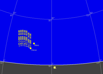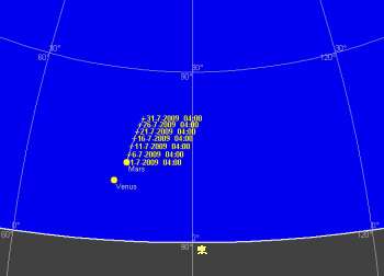 今月の金星も明けの明星として東の空に輝きます。地平線に近い所にあり、光度も-4.0等に落ちます。19日の明け方には三日月、金星、火星、アルデバラン、プレアデス星団のランデブーが見られます。