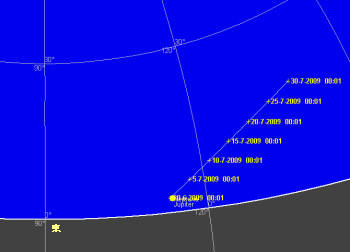 日付 出 正中 没 01 7 2009 23:39:09 4:39:31 9:35:50 11 7 2009 22:58:43 3:57:47 8:52:42 21 7 2009 22:17:41 3:14:59 8:08:05 31 7 2009 21:36:10 2:31:22 7:22:19 ![]()