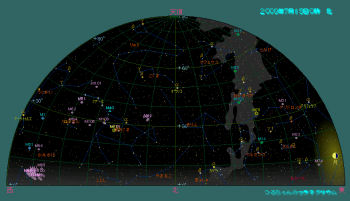 夜光雲はオーロラの様にアレート情報が有りませんので、毎日注意して夜空を観望するか、独流星研究会大気光学部門のBBSをこまめにチェックして下さい。 夜空も夏の星座に入れ替わりました。東の空には白鳥座のデネブ、こと座のベガ、ワシ座のアルタイルで構成される夏の大三角が見えています。うしかい座とおとめ座が西に傾きました。南の低いところにはさそり座の頭が見えています。天頂にはヘラクレス座の大きな四角が、その南にはへびつかい座が大きく広がっています。北の空高くにりゅう座が横たわり、おおぐま座は西に傾き、北極星をはさんだ北東の空にカシオペア座が高度をあげてきました。北の空低い所にはぎょしゃ座のカペラが見えています。カペラは高緯度のドイツでは一年中地平線下に沈まない周極星になっています。