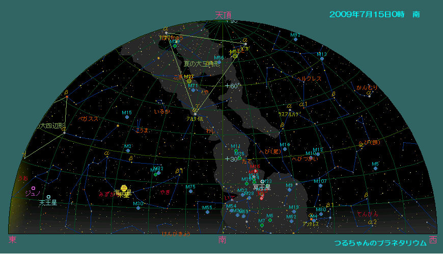 今月の惑星の観望時間帯は夜明け前に集中します。木星の出も早くなり、観望しやすくなります。 7月の天気 7月15日0時頃の空