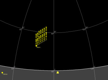 日付 出 正中 没 01 9 2009 20:28:36 2:22:43 8:12:48 11 9 2009 19:48:36 1:41:59 7:31:19 21 9 2009 19:08:34 1:01:12 6:49:47 01 10 2009 18:28:33 0:20:26 6:08:18 ![]()