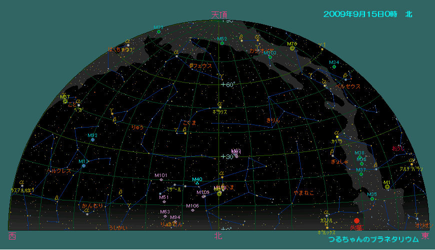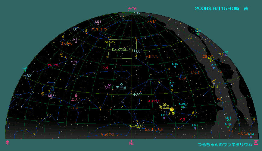 正直言って、望遠鏡より双眼鏡での観望の方がよっぽど楽しいですね。倍率は7倍も有れば十分です。 今月は明るい惑星達は殆ど太陽の側に有りますが、火星の出が早くなり、木星と同様観望し易くなります。 9月の天気 9月15日0時頃の空