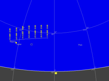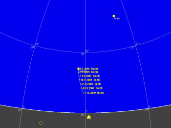 日付 出 正中 没 01 9 2009 0:46:20 8:55:46 17:05:12 11 9 2009 0:34:45 8:43:10 16:51:27 21 9 2009 0:23:43 8:29:29 16:35:02 01 10 2009 0:12:41 8:14:33 16:16:06 ![]()