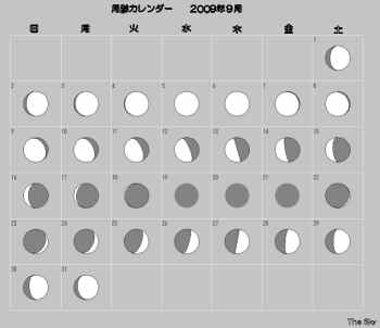 日付 出 正中 没 01 9 2009 19:28:08 0:27:36 5:23:04 11 9 2009 18:48:18 23:43:17 4:42:20 21 9 2009 18:08:30 23:03:05 4:01:43 01 10 2009 17:28:46 22:23:02 3:21:19 ![]()