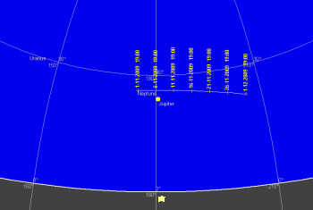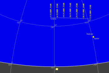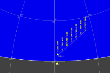 日付 出 正中 没 01 11 2009 15:24:49 21:10:49 3:00:52 11 11 2009 14:45:06 20:30:46 2:20:25 21 11 2009 14:05:31 19:50:58 1:40:23 01 12 2009 13:26:05 19:11:29 1:00:49 ![]()