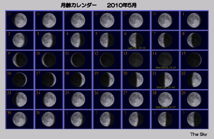 日付 出 正中 没 01 5 2010 3:44:40 8:46:40 13:48:41 11 5 2010 3:05:40 8:07:53 13:10:07 21 5 2010 2:26:33 7:28:53 12:31:15 31 5 2010 1:47:19 6:49:42 11:52:04