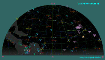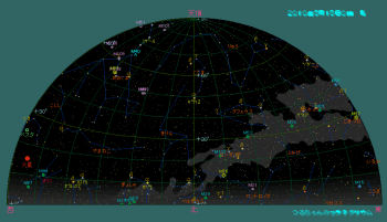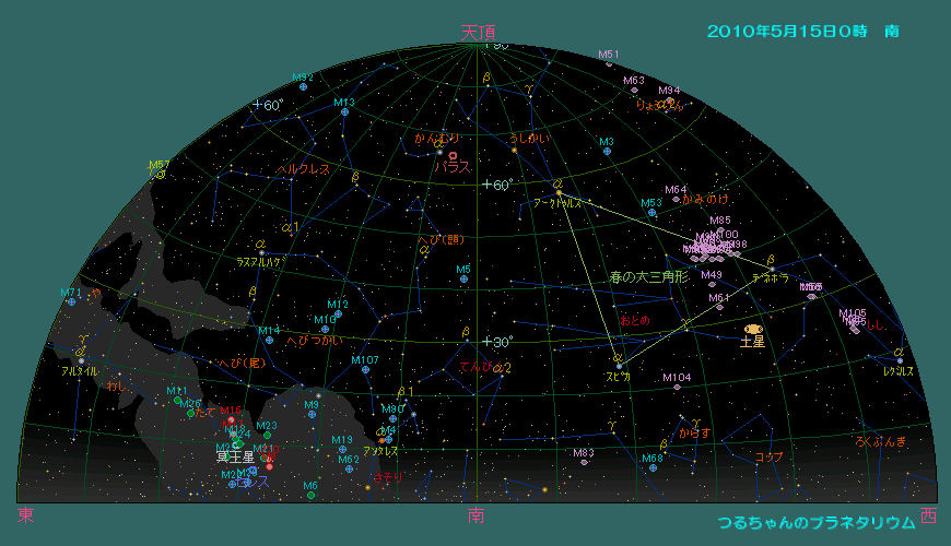 又今年の4月はいきなり暖かくなったので、花粉が一挙に飛び出しました。花粉症の人には憂鬱な季節ですが、この花粉の為に太陽の回りにカラフルな花粉光冠が見える事が有ります。花粉が多く飛んでいるときは是非注意して見て下さい。出来ればサングラスを掛けるとか、手で太陽を遮るなど光線が直接目に入らないように配慮して下さい。 北欧のオーロラの季節は終わりましたが、夜光雲の季節もまもなく始まります。条件が良ければ5月下旬頃から見え出しますので、晴れた日は北の空を注意して見て下さい。 空はすっかりおとなしい春の星座に入れ替わりました。