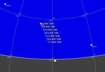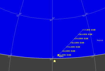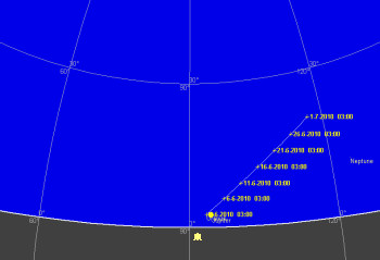 天王星のでは早くなりますが、完全に暗くならない欧州の空では観望は難しいでしょう。今月は木星の直ぐ側に居るので、慣れた人ならば夜明け前の空で見つける事が出来るでしょう。