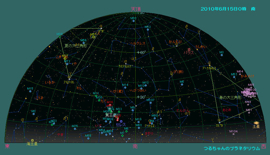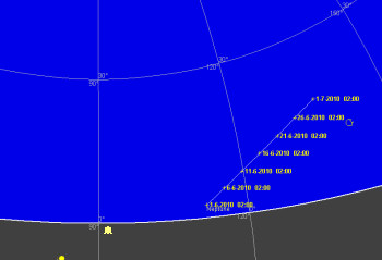 又この時期は夜光雲の季節でも有ります。昨年は6月から7月にかけて夜光雲が大発生しました。夜光雲はオーロラの様にアレート情報が有りませんので、毎日注意して夜空を観望するか、独流星研究会大気光学部門のBBSをこまめにチェックして下さい。このBBSは情報の速さではぴか一です。 今月は特に目だったハイライトは有りません。