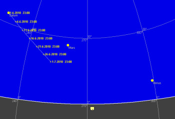 6月の夜空がすっかりおとなしい春の星座に入れ替わりました。牛かい座が南の空高く昇り、北斗七星が北の空高く、カシオペア座が地平線すれすれに見えています。西の空には春の星座を代表するしし座が傾き、その近くには土星が輝いています。南西にはおとめ座が見えています。夜半になると夏の星座が昇ってきます。さそり座、いて座、白鳥座、こと座、わし座などの明るい星座が夜空が飾ります。中央ヨーロッパから見るとさそり座も地平線を這う様に動きます。さそり座といて座の間には天の川銀河の中心部有り、その周りには沢山の星雲星団が有ります。アンドロメダ座のアンドロメダ大銀河(M31)、ペルセウス座の2重星団(h-χ、エイチ・カイと読む)と散開星団(M34)も夜明け前に東の空に昇り、ゆっくり観望出来る時期になりました。これらの星雲星団は双眼鏡が有れば十分です。かみのけ座銀河団も見ごろですので、お忘れなく。 今月の惑星は金星が夜半前宵の明星として輝きます。木星の出が早くなり、観望しやすくなります。土星と火星は西の空にかなり傾きましたが、まだまだ観望可能です。