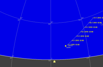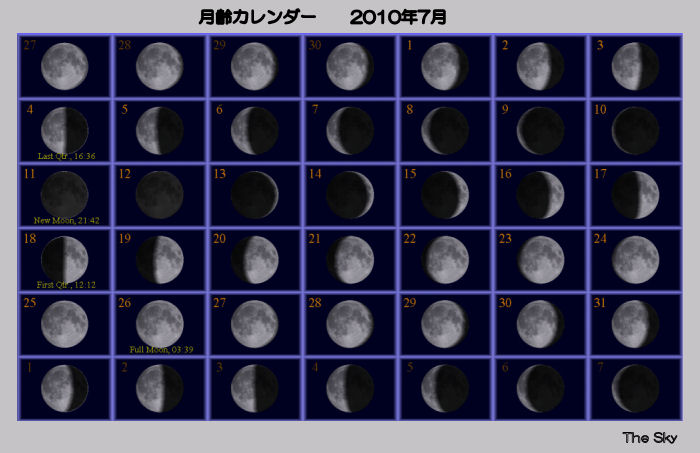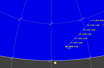 日付 出 正中 没 01 7 2010 23:41:04 4:46:54 9:48:47 11 7 2010 23:01:24 4:06:56 9:08:28 21 7 2010 22:21:40 3:26:49 8:27:58 31 7 2010 21:41:53 2:46:35 7:47:17 ![]()