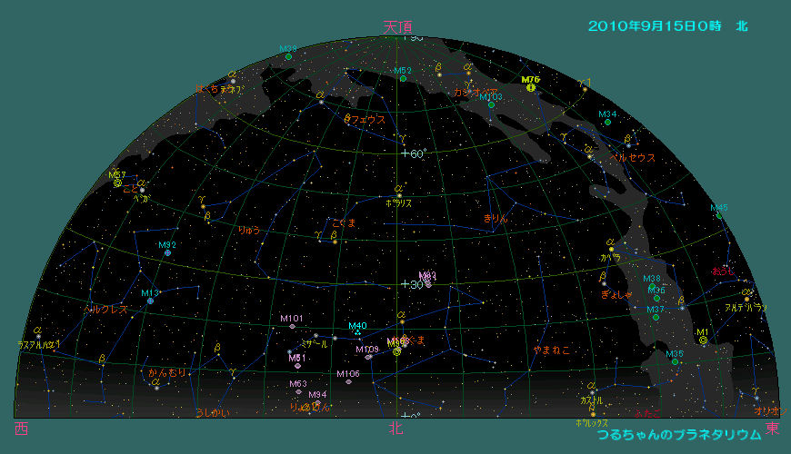 南西の空にはいて座とさそり座付近の星雲星団群(M4、6、7、8、20、22)、アンドロメダ座のアンドロメダ大銀河(M31)、ペルセウス座の2重星団(h-χ、エイチ・カイと読む)と散開星団(M34)、ヘルクレス座の散開星団(M13)、へび座の散開星団(M5)と見ものは一杯。