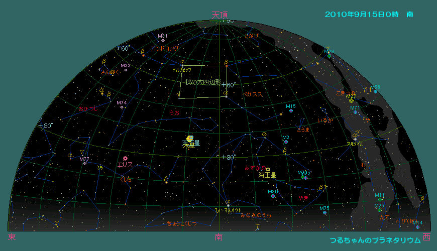 こと座のベガ、白鳥座のデネブ、わし座のアルタイルで作られる夏の大三角が西に傾き、さそり座は既に地平線下に隠れてしまうと、東の空に秋の星座が昇ってきます。あの有名なアンドロメダ大星雲(M31)も見ごろになってきました。秋の四辺形とも言われるぺガスス座は東の空に昇り、南東の空にはにはうお座が上ってきます。太陽は秋分の日丁度うお座の反対側に有り、日が落ちるとうお座が昇ってきます。