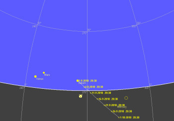 土星 没が早くなった土星は日没直後の西の空で観望出来ます。光度は1.1等を保ちますが、未だ明るい空では目立つ存在では有りません。先月に引き続き、金星と火星が近くに居ます。